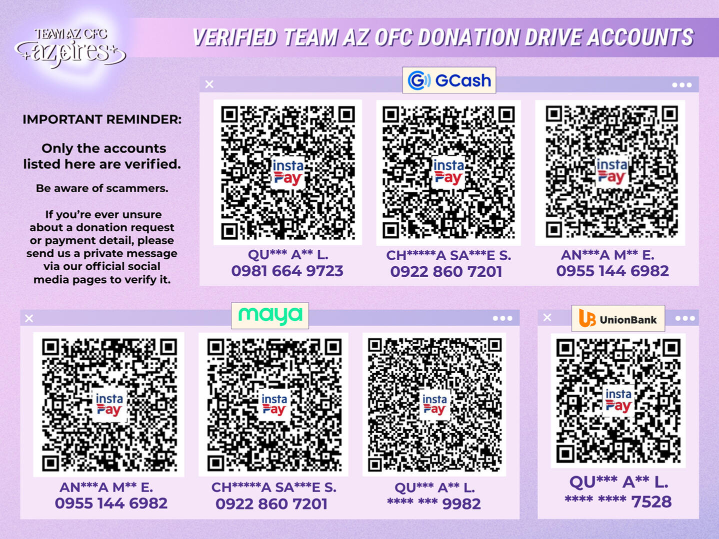 Only the accounts listed here on the official Team AZ OFC site and posted by the Team AZ OFC accounts are verified.🚫 Be aware of scammers.If you’re ever in doubt about a donation request, please send us a private message through our official social media channels for confirmation.